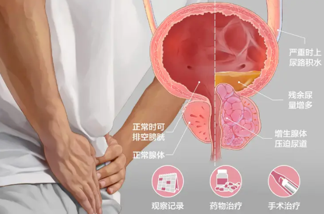 对于重症前列腺增生患者,需要积极干预。由于疾病呈进行性发展,不及时干预,下尿路进行性梗阻会进行性加重,极易导致尿潴留,伴随而来的是反复尿道感染、血尿、膀胱结石,膀胱功能受损,甚至出现肾积水、肾功能不全或尿毒症,预后较差。