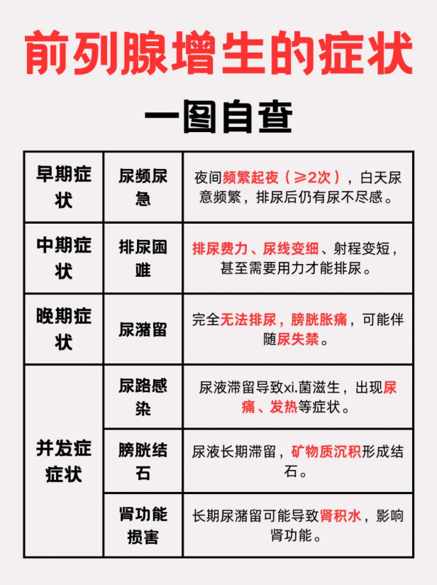 良性前列腺增生是老年男性的最常见疾病之一,50岁以上男性都应该定期进行前列腺体检,并通过识别下尿路症状和普及前列腺增生知识来获得早期诊疗,最大限度地减少前列腺增生疾病对男性健康的危害。