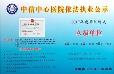 按照河南省卫计委“关于实施医疗机构卫生监督量化分级管理制度的通知”要求,洛阳市卫生计生监督局依据国家有关法律法规,对各医疗机构依法执业中的执业资质、人员资质、传染病防治、血液安全、放射诊疗和防护等相关内容进行了相应频次的现场检查和量化评分,并结合省、市卫计委统一部署的专项检查和暗访结果,评定出2017年度医疗机构依法执业等级,其中依法执业量化分级A级单位19家,中信中心医院名列其中。此外还评定出依法执业量化分级B级单位13家、依法执业量化分级C级单位2家等。